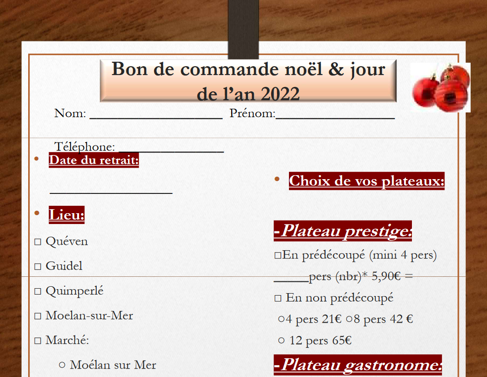 Nos plateaux de fin d’année sont disponibles à la commande directement sur notre site ! Pour nos plateaux classiques, merci de nous contacter au 06 64 76 04 39.